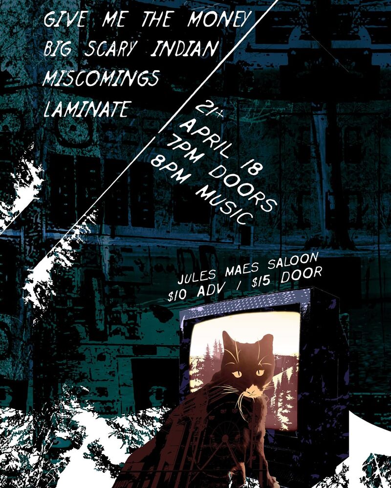 Give Me The Money / Big Scary Indian / Miscomings / Laminate Friday, April 18, 7:00 PM at Jules Maes Saloon - Event Page Add to Google Calendar
