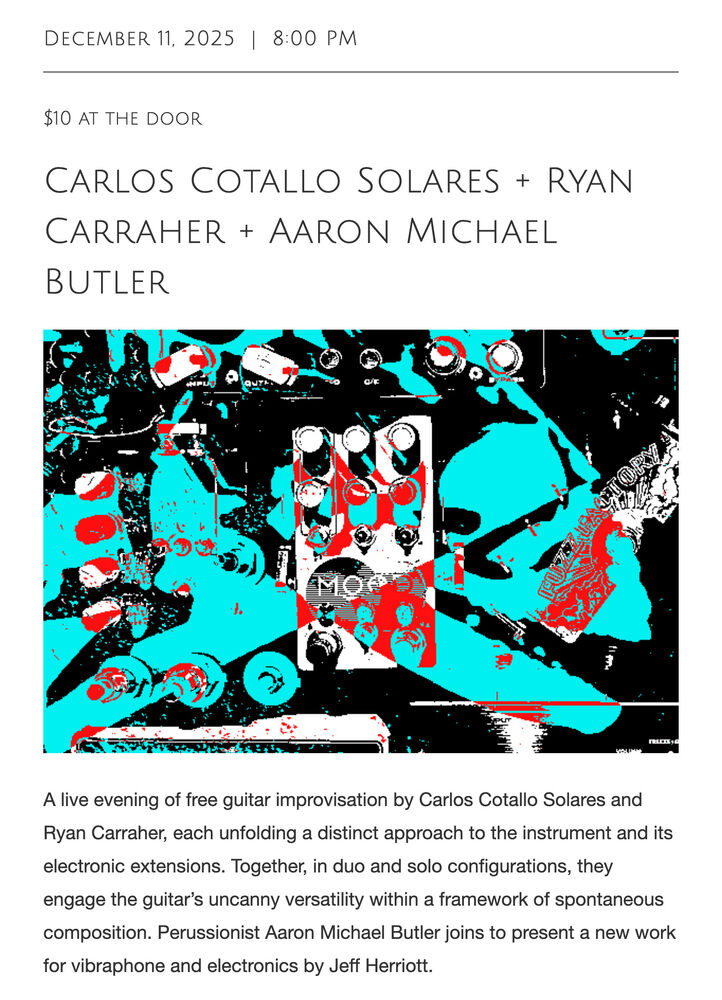 Carlos Cotallo Solares + Ryan Carraher + Aaron Michael Butler Thursday, December 11, 8:00 PM at Chapel Performance Space - Event Page Add to Google Calendar