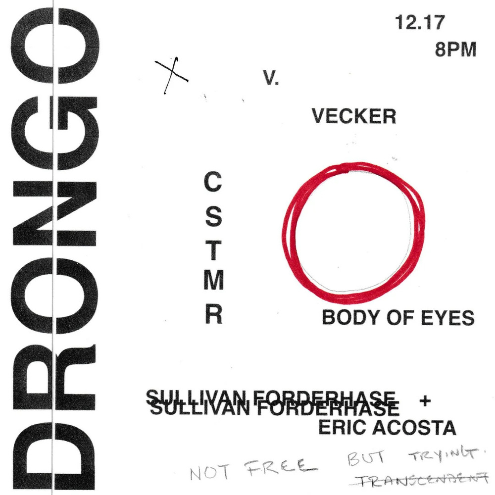 Sullivan Forderhase + Eric M Acosta / CSTMR / Body of Eyes / V. Vecker Wednesday, December 17, 8:00 PM at Drongo Tapes HQ - Event Page Add to Google Calendar