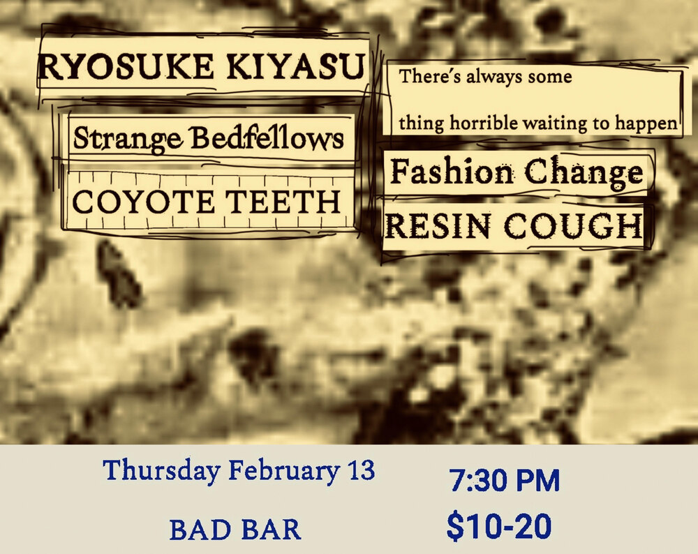 Ryosuke Kiyasu / Strange Bedfellows / Coyote Teeth / Fashion Change / Resin Cough Thursday, February 13, 7:30 PM at Bad Bar - Event Page Add to Google Calendar