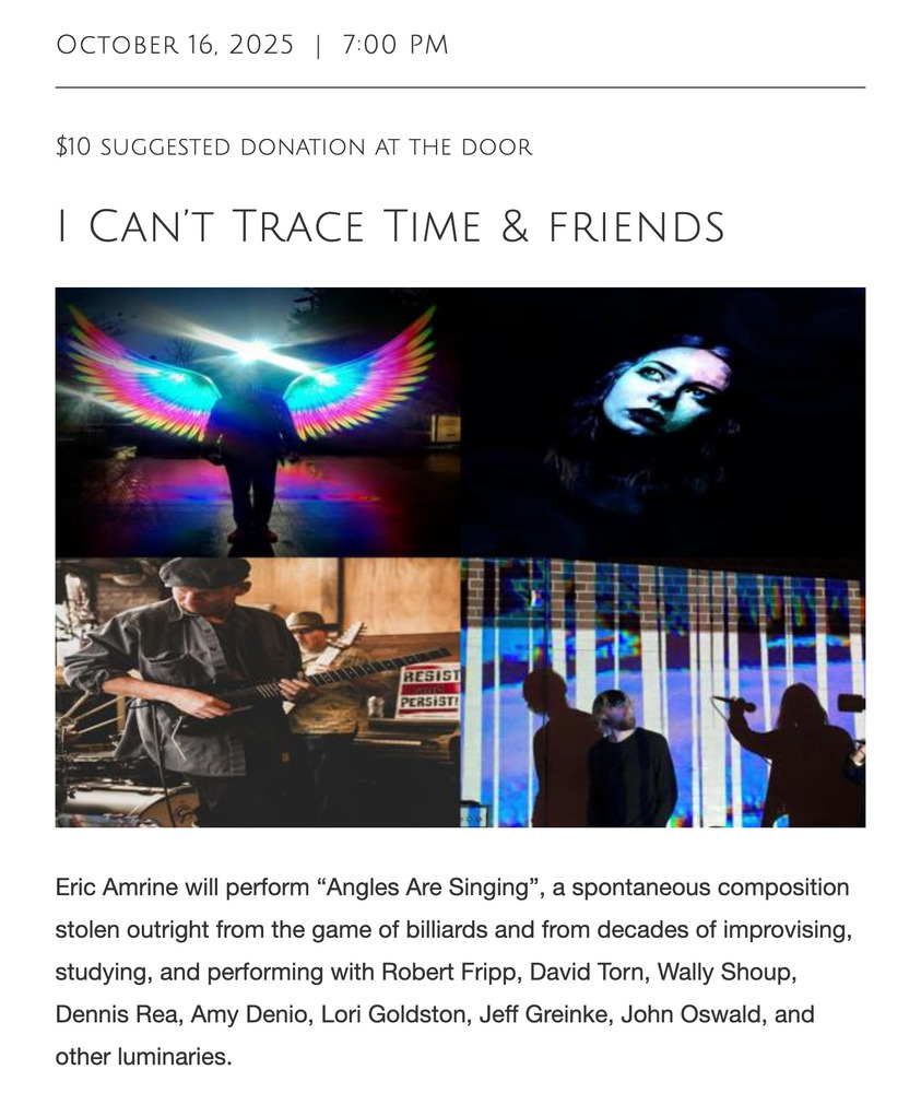 I Can’t Trace Time Thursday, October 16, 7:00 PM at Chapel Performance Space - Event Page Add to Google Calendar