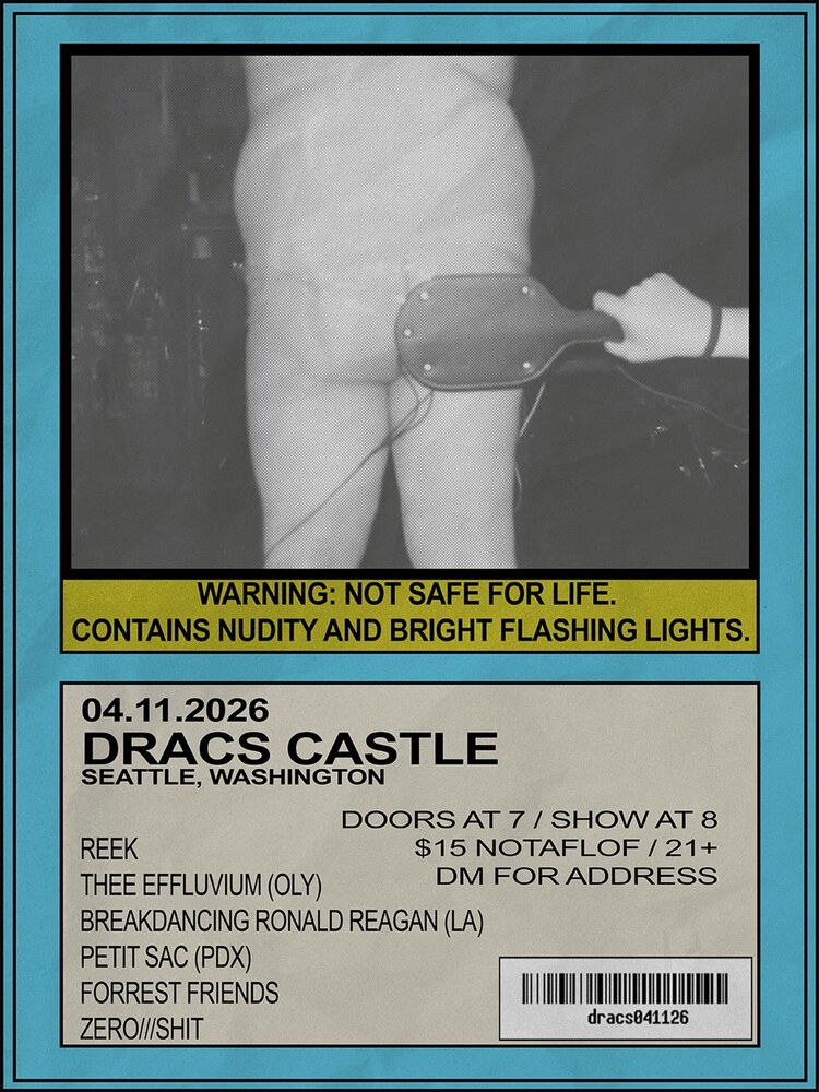 rEEk/ Thee Effluvium / Breakdancing Ronald Reagan / Petit Sac / Forrest Friends / Zero///Shit Saturday, April 11, 7:00 PM at Dracula’s Castle - Event Page Add to Google Calendar