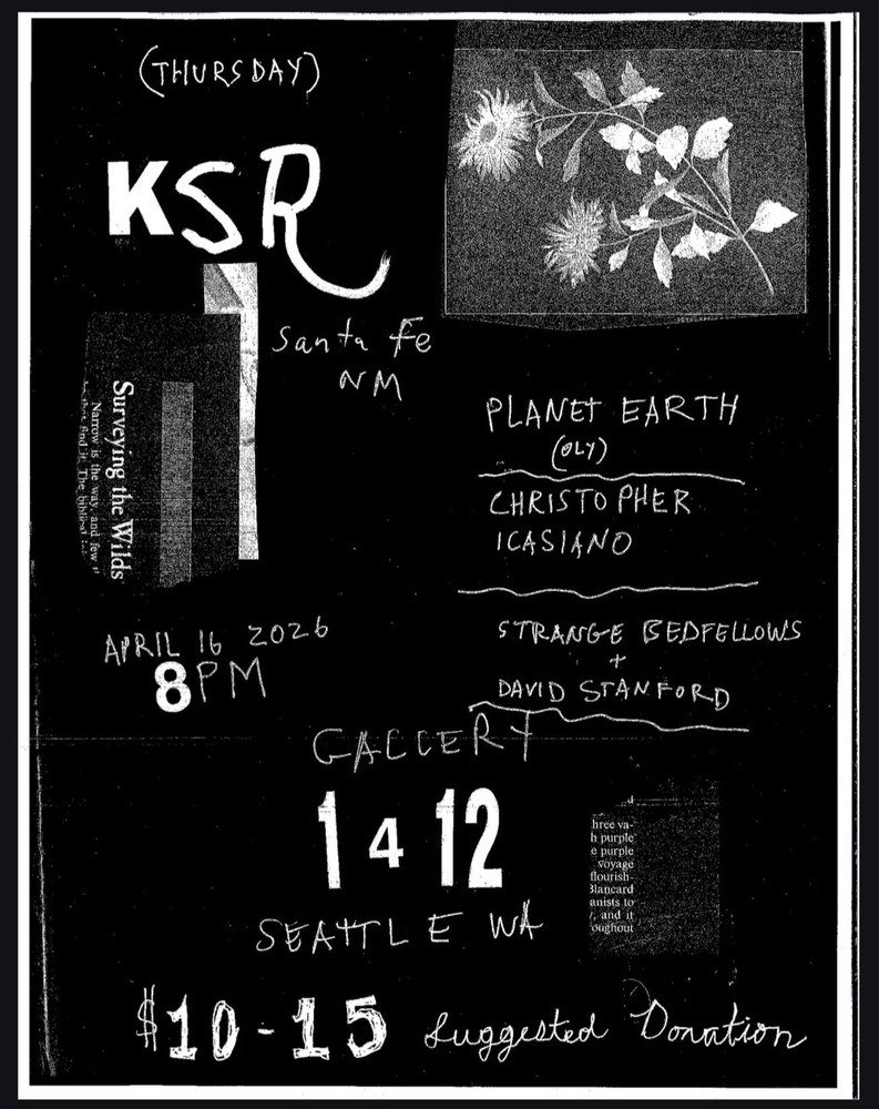 K/S/R / Planet Earth / Christopher Icasiano / Strange Bedfellows + David Stanford Thursday, April 16, 7:30 PM at Gallery 1412 - Event Page Add to Google Calendar