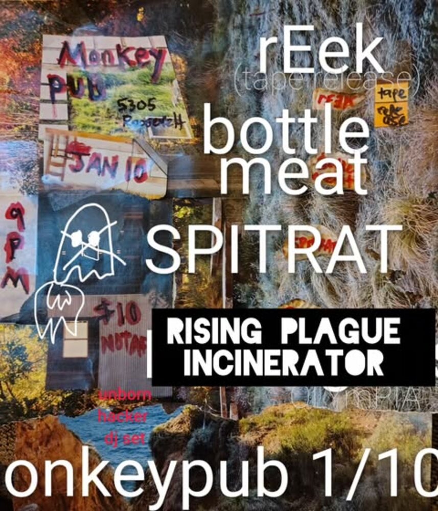 rEEk / Bottle Meat / SPITRAT / Rising Plague Incinerator Saturday, January 10, 9:00 PM at The Monkey Pub - Event Page Add to Google Calendar