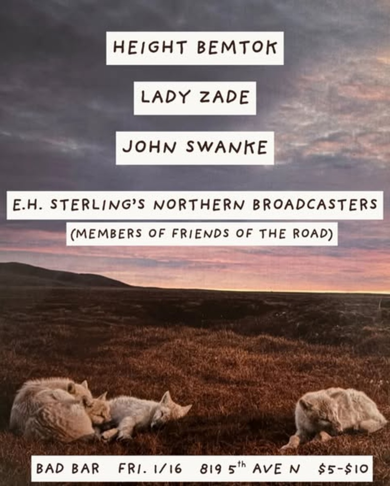 Height Bemtok / Lady Zade / John Swanke / E.H. Sterling’s Northern Broadcasters Friday, January 16, 7:00 PM at Bad Bar - Event Page Add to Google Calendar