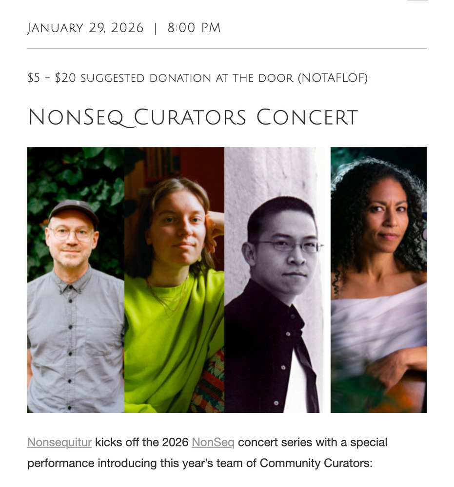NonSeq Curators Concert Thursday, January 29, 8:00 PM at Chapel Performance Space - Event Page Add to Google Calendar