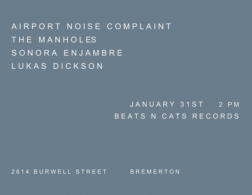 Airport Noise Complaint / The Manholes / sonora enjambre / Lukas Dickson Saturday, January 31, 2:00 PM at Beats N Cats Records (Bremerton) - Event Page Add to Google Calendar