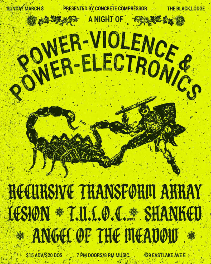 Recursive Transform Array / Lesion / T.U.L.O.C. / Shanked / Angel of the Meadow Sunday, March 8, 7:00 PM at Black Lodge - Event Page Add to Google Calendar